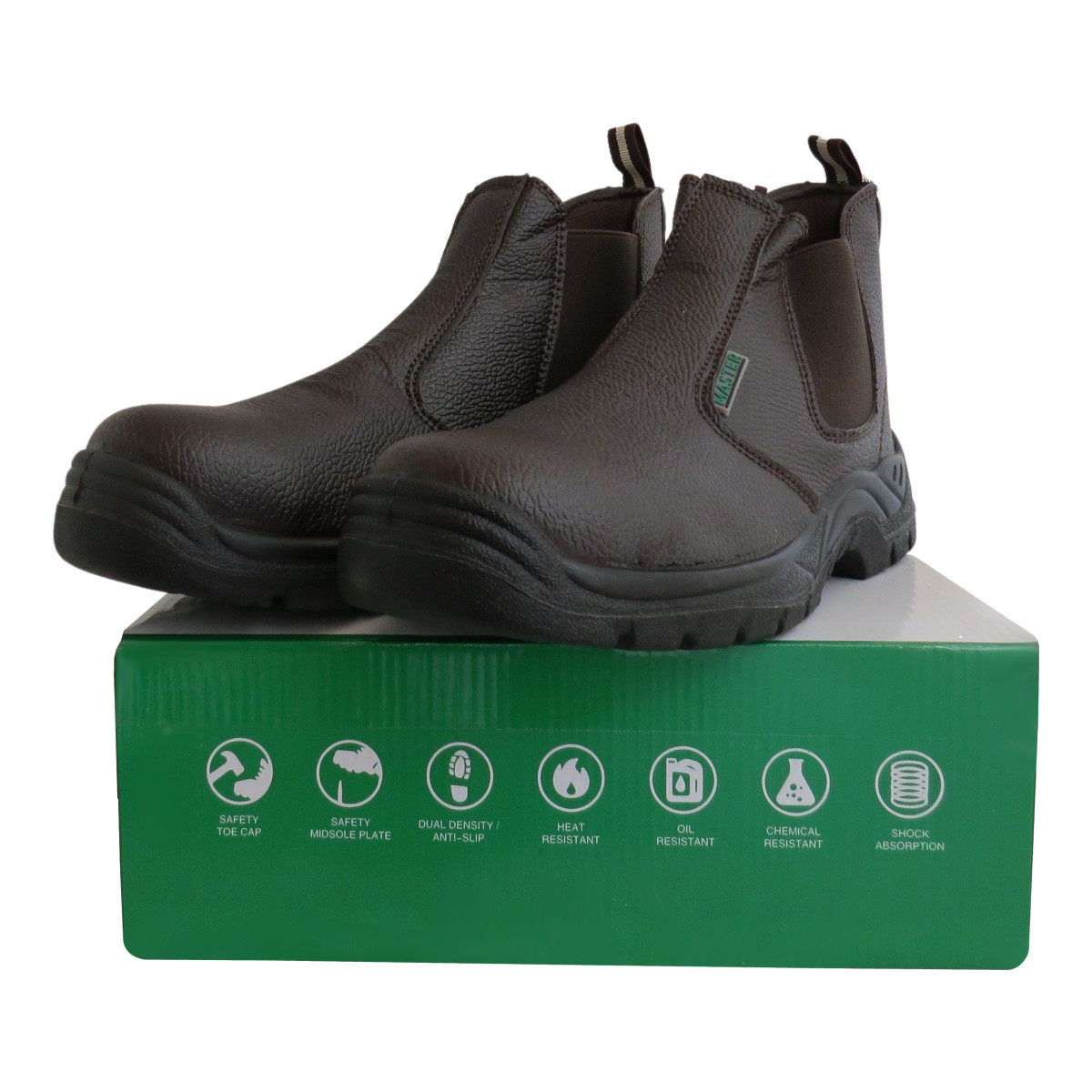 Master safety chelsea boots are lace free and provide comfort and protection with steel toe caps and mid soles. Cushioned insoles, shock absorbing and anti-slip PU soles render these boots ideal for any work environment. Suitable for use in many areas including warehousing, engineering, construction, and mining to name but a few. Available in black and brown colours in sizes from three to fourteen.