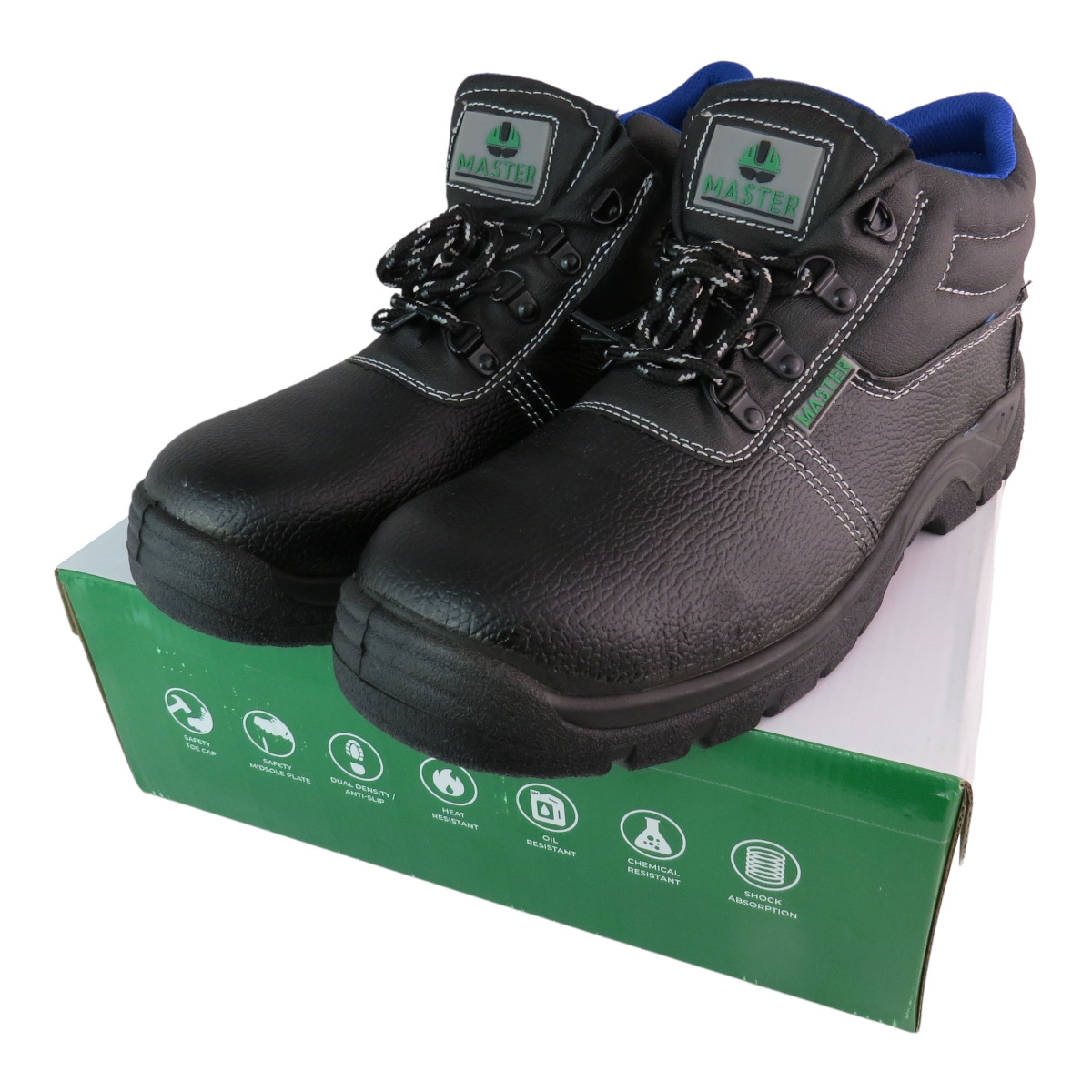 Master safety boots are lace-up boots providing comfort and protection with steel toe caps and mid soles. Cushioned insoles, shock absorbing and anti-slip PU soles render these boots ideal for any work environment.  Suitable for use in many areas including warehousing, engineering, construction, and mining to name but a few.
