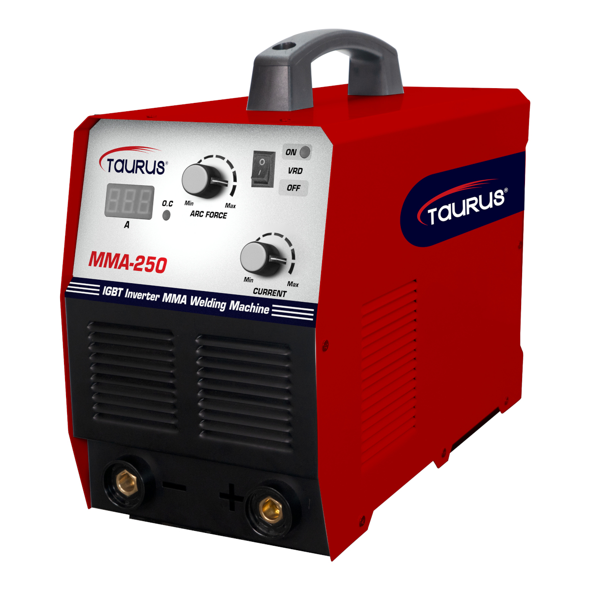 The TAURUS MMA 250VRD single phase, 220V stick-electrode welding machine is designed and manufactured to the latest digital-inverter technology for demanding industrial applications. It is a compact light-weight inverter machine which ensures a clean, high-quality weld and excels in basic and rutile electrode welding. Professional and DIY welders can experience the built-in characteristics of anti-stick, hot-start and arc-force. The advanced power input system will detect and handle a voltage drop or a spike of up to 25%. This will not only safeguard the machine against damage resulting from erratic power supply, but will also ensure smooth, uninterrupted operation. The VRD has an added safety function keeping the output voltage low (lowering the output voltage) when the machine is not in use.
